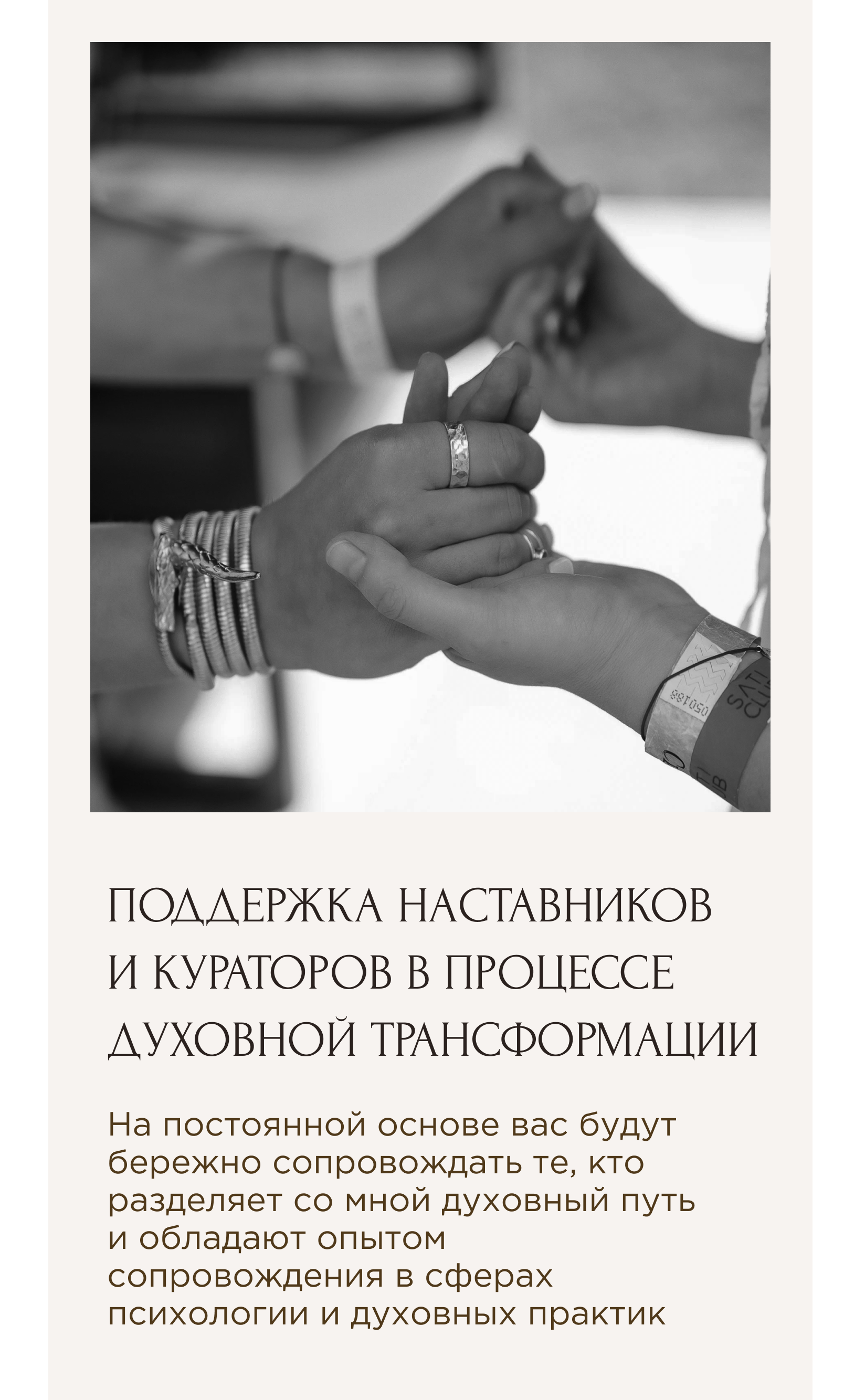 На постоянной основе вас будут бережно сопровождать те, кто разделяют со мной духовный путь и обладают опытом сопровождения людей в сферах личностного роста, психологии и духовных практик