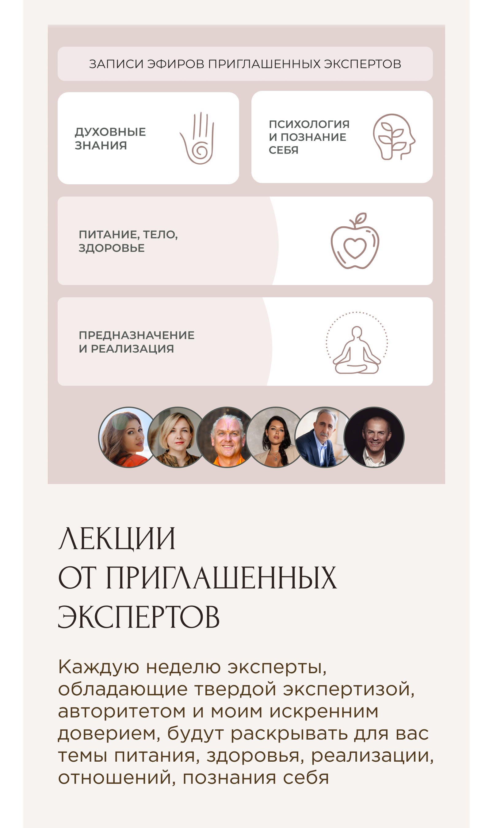 Каждую неделю эксперты, обладающие твердой экспертизой, авторитетом и моим искренним доверием, будут раскрывать для вас темы питания, здоровья, реализации, отношений, познания себя